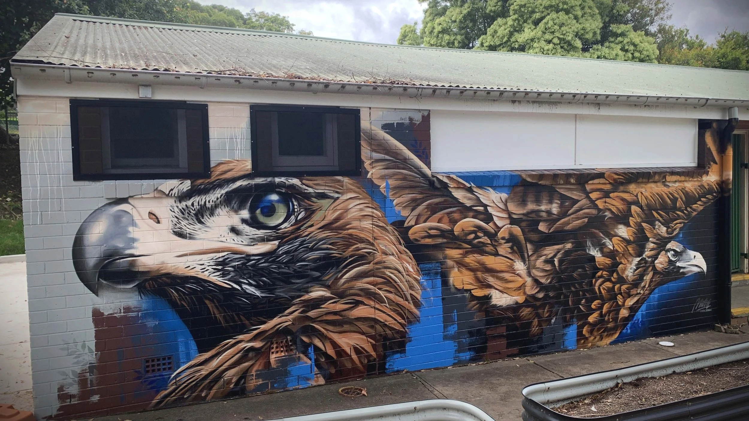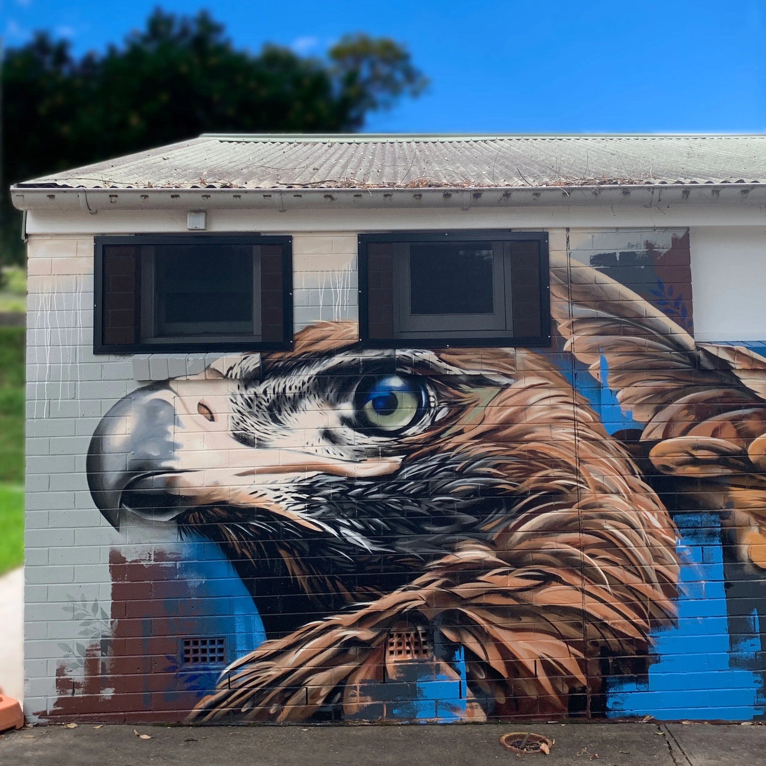 A recent upgrade to the schools garden area led Glendale East to want to also add a mural to the space. The school was after a Wedge Tailed Eagle so we paired a nice close up with a full bodied one to fill out the space. Background incorporated the schools colours to tie it all together nicely.