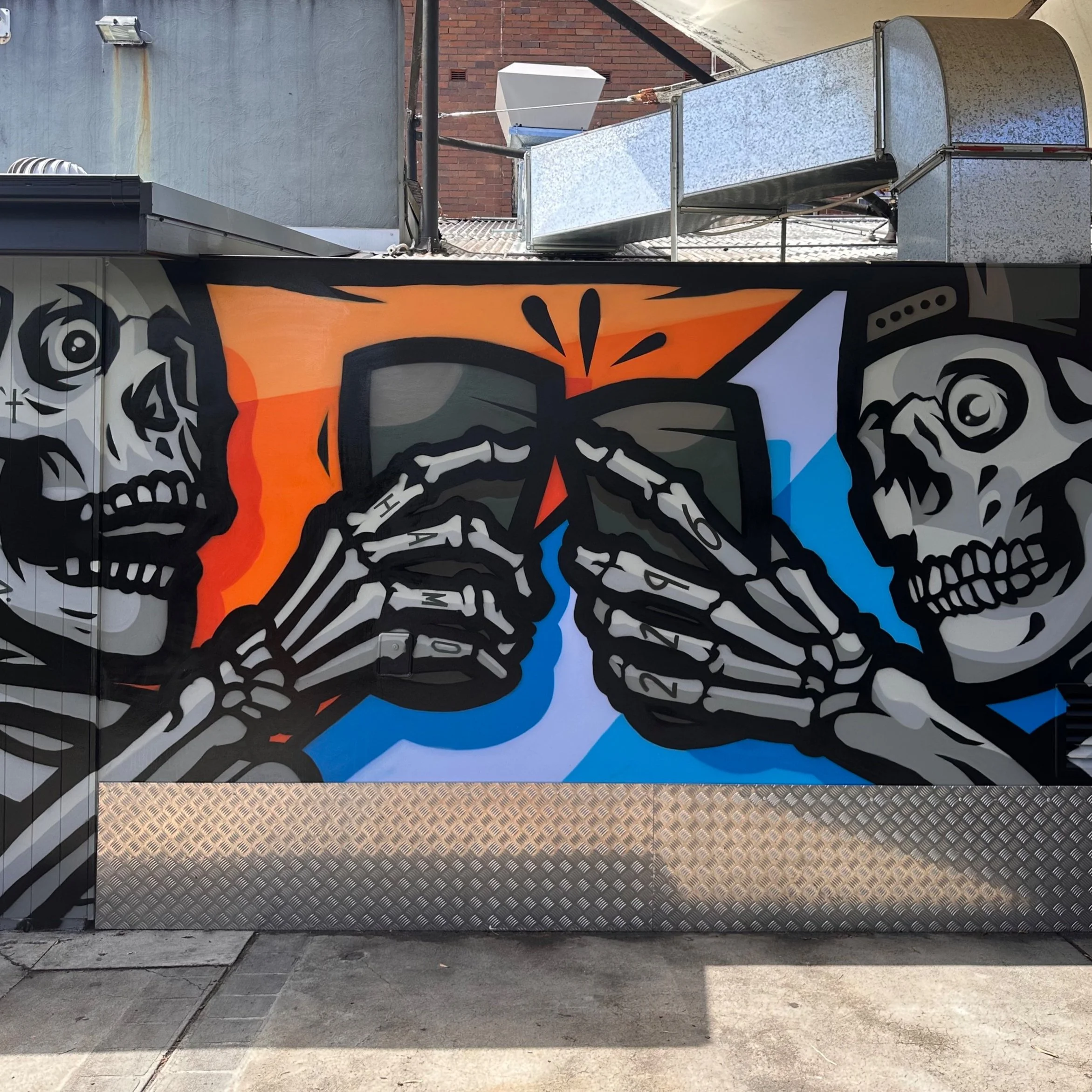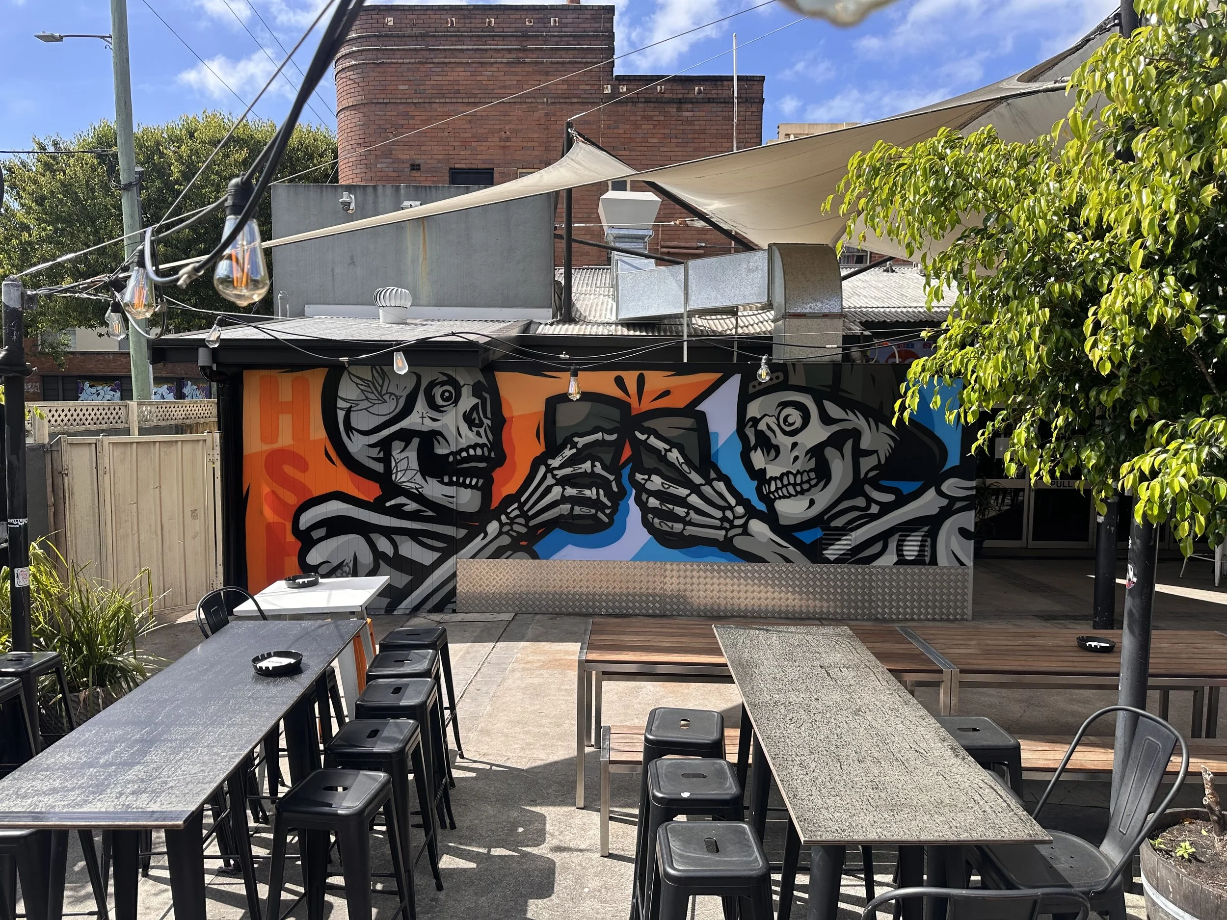 Good times, and sharing a beer with friends is what Hamilton Station Hotel is all about. Added these 2 guys doing just that. The space needed a bit of life and this bright, illustrated, gig poster inspired style was just the right brew.