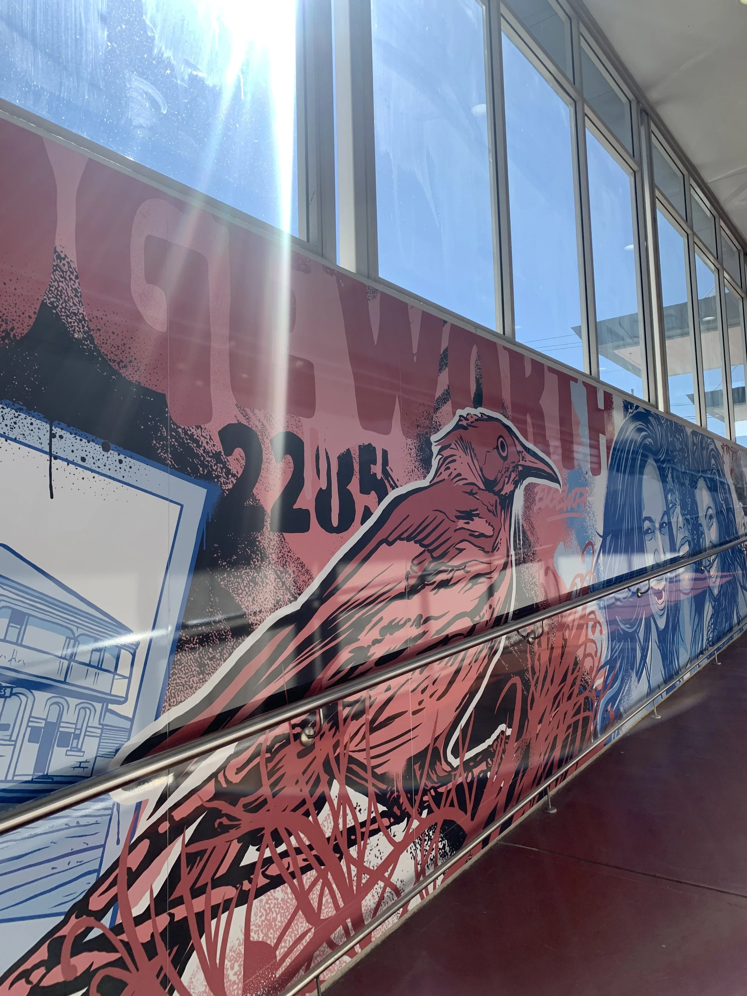 Primewest Shopping centre was after an artwork that celebrated the history of the local area to go along the ramp, leading from the centre to the carpark. The space was quite long so we were able to pack in a bunch of local historical references, fauna, sporting and some feel good, happy imagery.