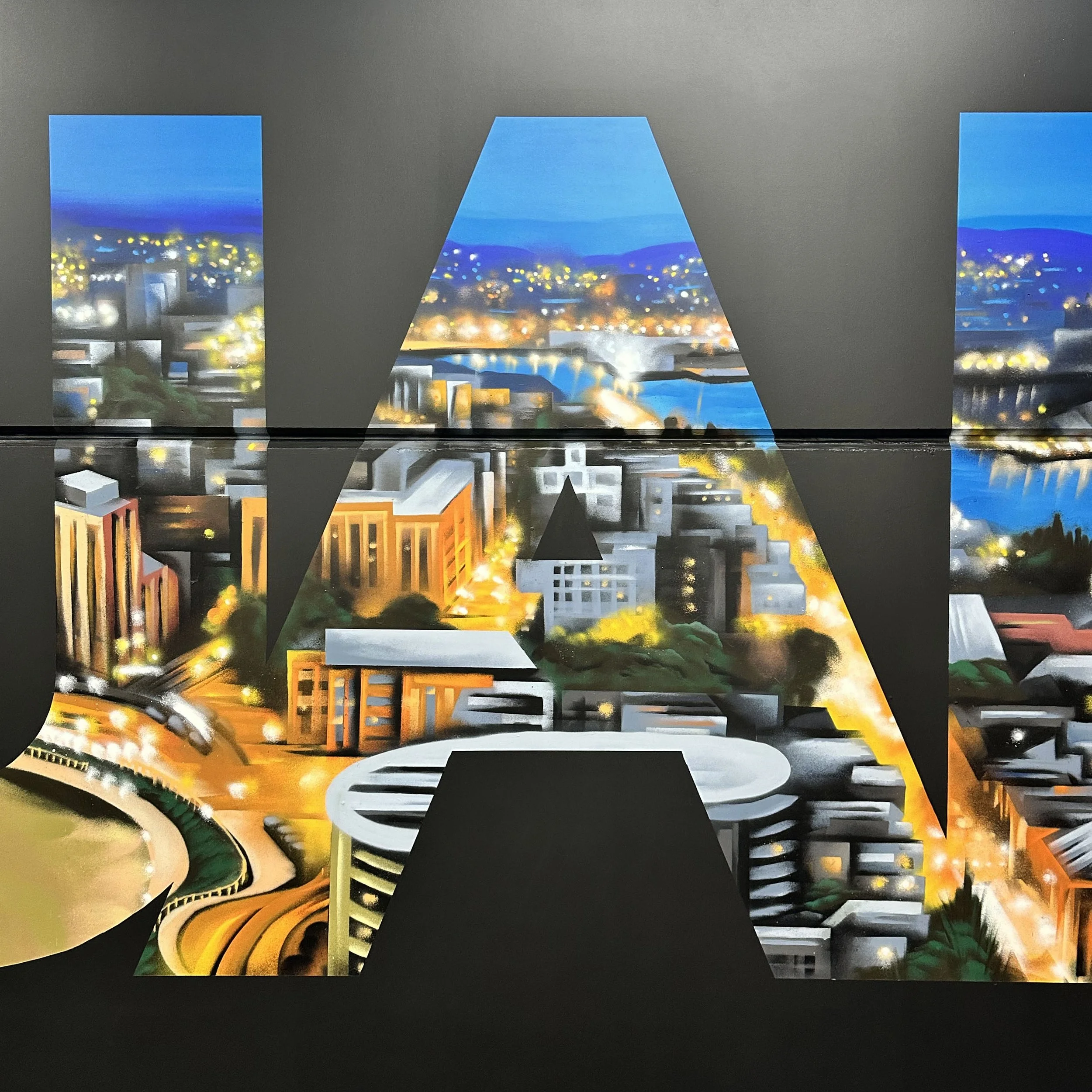 Quad Construction approached me to add a little bit of character and colour to their newly built office space. Being a proudly Newcastle founded company, we figured that adding a large detailed aerial view of Newcastle clipped inside the QUAD letters was not only a unique piece, but a great conversation starter for visiting clients.